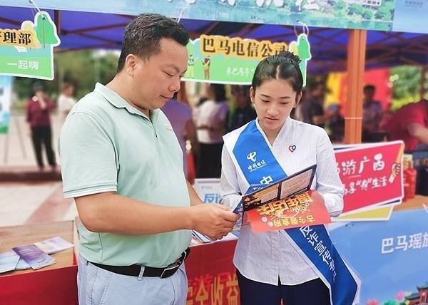 巴马县举办中国旅游日主题活动,中国电信工作人员在现场开展文旅+反诈融合宣传。广西电信供图